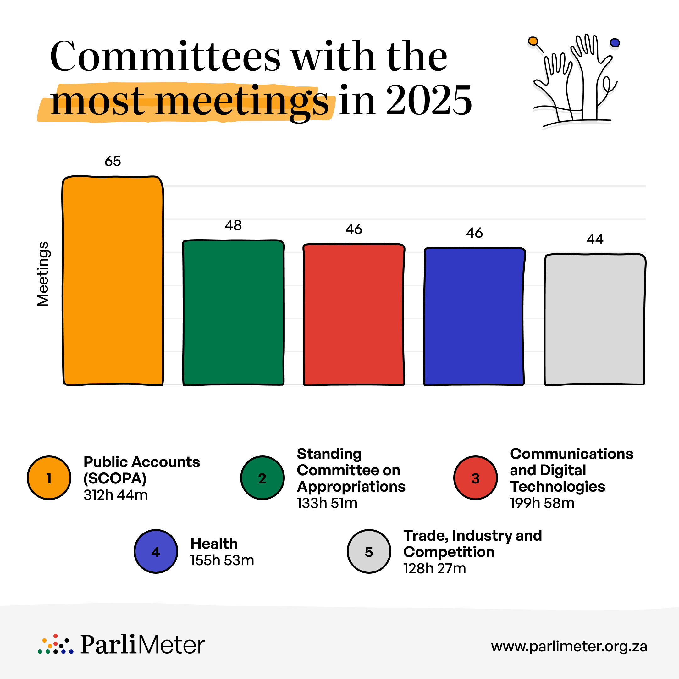 Parliamentary committees held an average of 30 meetings per committee throughout 2025. At number one, the Standing Committee on Public Accounts (SCOPA) convened 65 meetings over the year, with a notable increase in total meeting time following the commencement of its inquiry into the financial governance of the Road Accident Fund (RAF) in October.